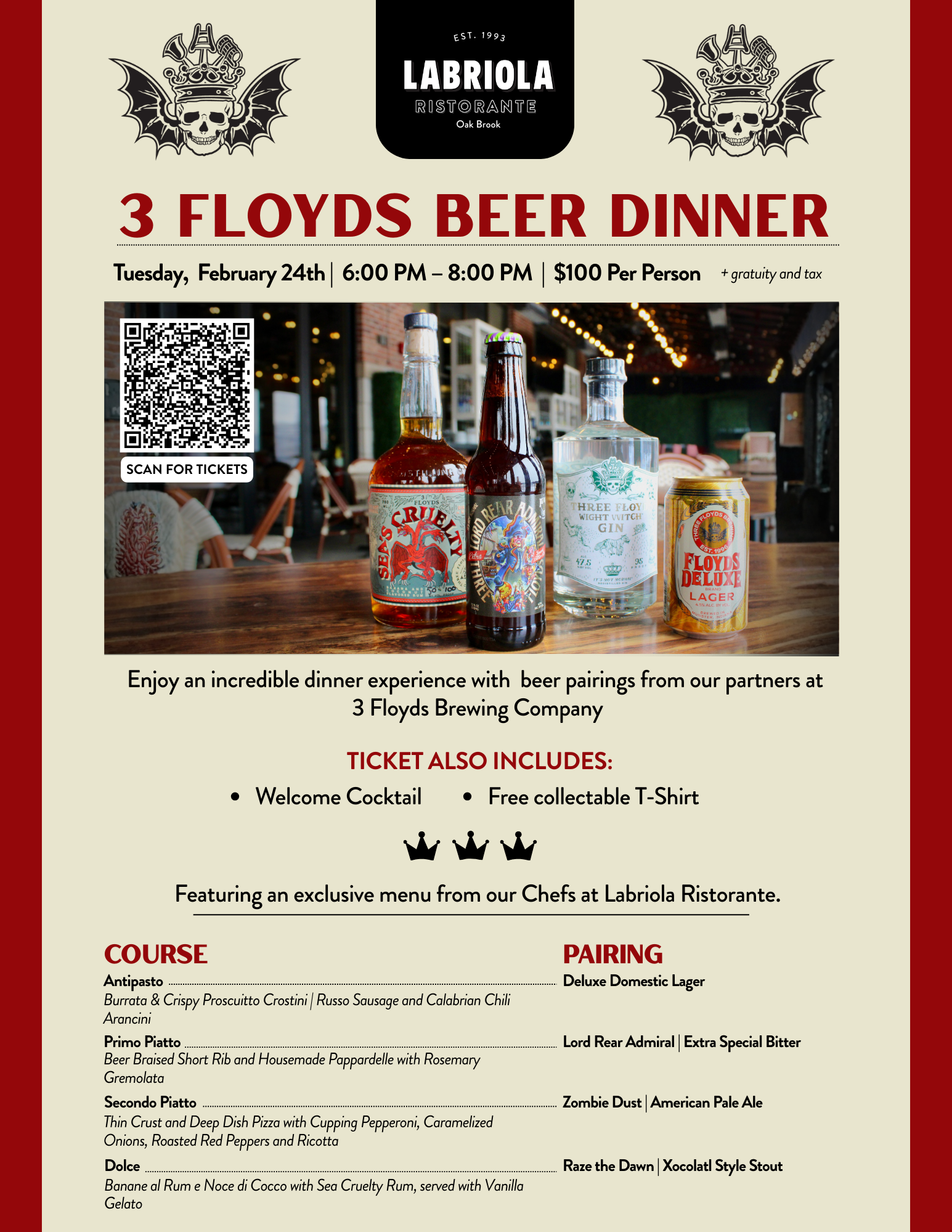 3 Floyds Beer Dinner at Labriola Ristorante Tuesday, February 24th | 6:00 PM – 8:00 PM | $100 per person