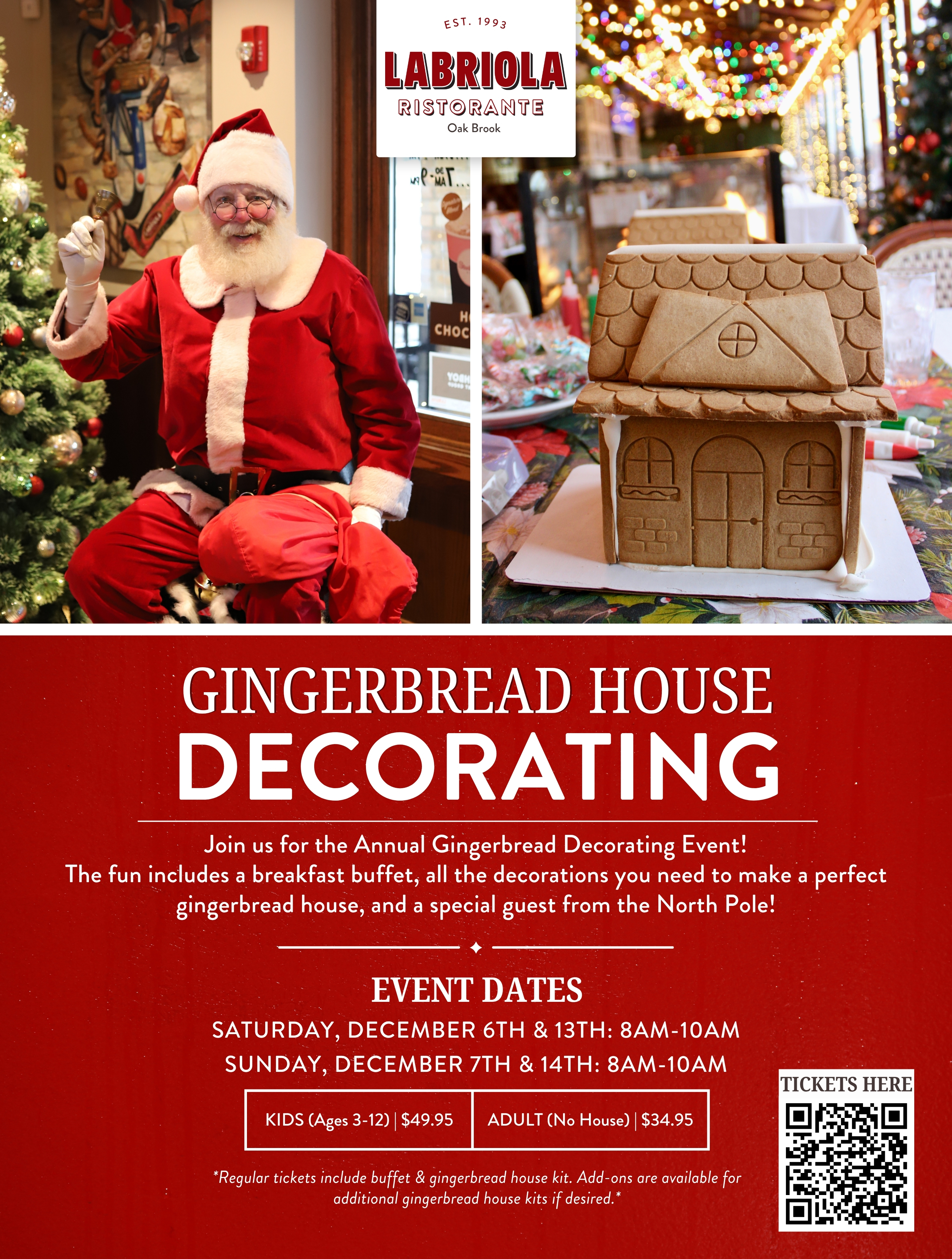 The fun includes a breakfast buffet, all the decorations you need to make a perfect gingerbread house, and a special guest from the North Pole!